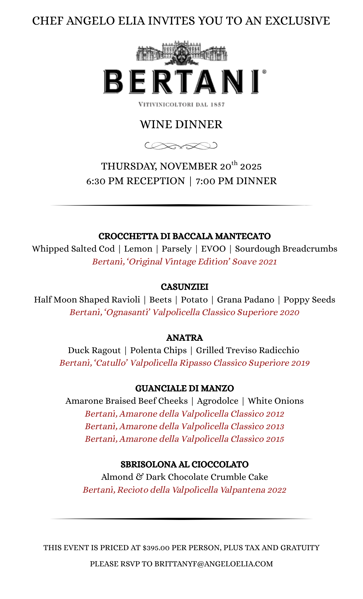 Join us for an elegant and immersive dining experience as Casa D’Angelo proudly presents a wine pairing dinner featuring the acclaimed wines of Bertani, one of Italy's most prestigious and historic wineries.This exclusive five-course wine dinner, priced at $395 per person (plus tax and gratuity), will showcase exquisite pairings thoughtfully curated to highlight the bold, expressive flavors of an iconic vineyard.
